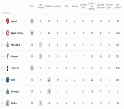 联赛阶段7轮过后,英超5支球队排名前八,展现出了强势的状态。能否创造6支球队晋级前八的奇迹,需要看曼城能否一鼓作气,在净胜球上超越巴萨和葡体,同时纽卡需要击败巴黎,切尔西、热刺、利物浦也都击败各自对手。