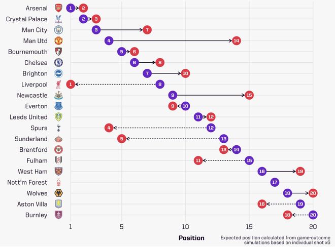 雷速体育10月1日讯 今日,国外知名数据机构公布了一项英超联赛前六轮预期积分排名的数据结论,其中目前位列榜首的利物浦期望排名仅位列第八,而排名第二的阿森纳期望排名是英超第一,实际排名第四的热刺预期排名仅为英超第12。 英超前六轮期望排名与实际排名 利物浦 第8/第1 阿森纳 第1/第2 水晶宫 第2/第3 热刺 第12/第4 桑德兰 第13/第5 伯恩茅斯 第5/第6 曼城 第3/第7 切尔西 第6/第8 埃弗顿 第10/第9 布莱顿 第7/第10 富勒姆 第15/第11 利兹联 第11/第12 布伦特福德 第14/第13 曼联 第4/第14 纽卡斯尔联 第9/第15 阿斯顿维拉 第19/第16 诺丁汉森林 第17(排名与期望一致) 伯恩利 第20/第18 西汉姆联 第16/第19 狼队 第18/第20 |