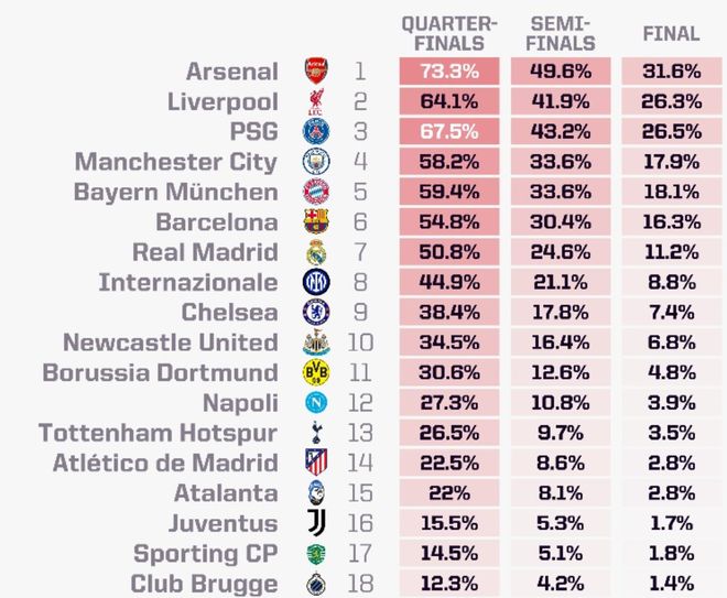 雷速体育10月2日讯 权威统计机构使用超级计算机进行计算后,认为阿森纳是本赛季欧冠的最大热门,利物浦、巴黎、曼城、拜仁、巴萨、皇马、国米、切尔西紧随其后。并给出了各大豪门进展到赛事各个阶段的预测概率,如下表所示。 超算预测欧冠冠军热门Top 10球队晋级16强概率八强概率四强概率决赛概率冠军概率阿森纳89.64%73.33%49.62%31.64%18.09%利物浦58.79%64.14%41.88%26.28%14.7%巴黎圣日耳曼79.87%67.53%43.24%26.54%13.96%曼城61.19%58.21%33.60%17.92%9.71%拜仁68.76%59.38%33.60%18.12%9.5%巴萨54.67%54.81%30.43%16.28%8.25%皇马62.36%50.82%24.62%11.24%4.94%国米54.25%44.88%21.15%8.81%3.73%切尔西37.13%38.36%17.81%7.36%3.51%纽卡斯尔38.96%34.53%16.35%6.85%3.13% |