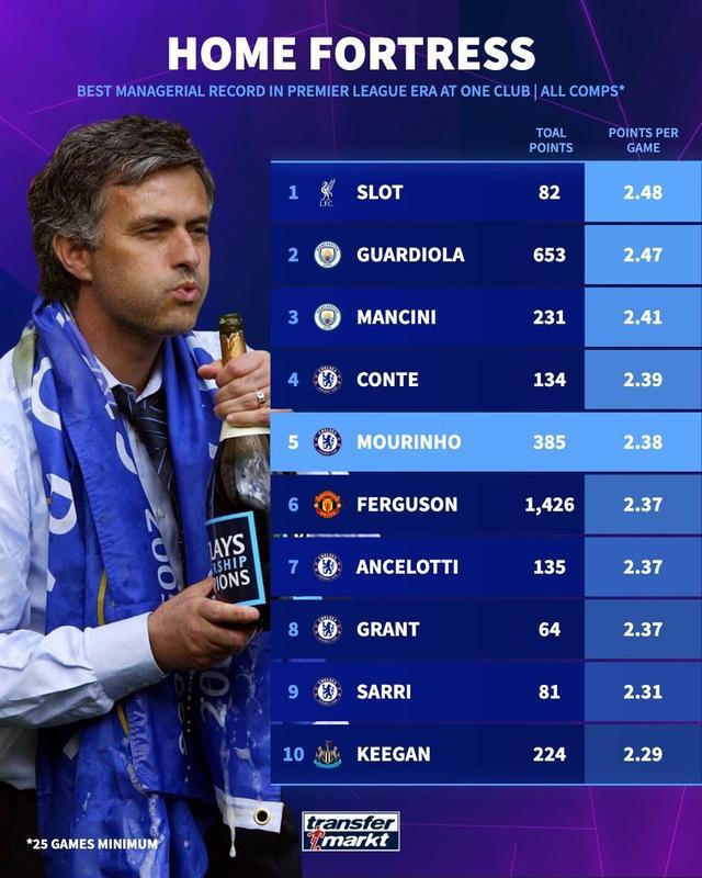 德国转会市场网站列出了英超执教单一球队各项赛事主场场均积分榜,利物浦主帅斯洛特以2.48分居首,瓜迪奥拉第二,穆里尼奥执教切尔西时期排名第五。