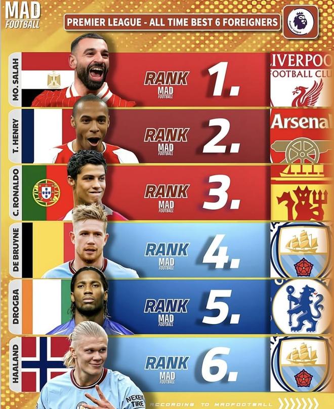 近日,MAD FOOTBALL 盘点了“英格兰超级联赛历史最佳外援6人”。这份排名引发了不少讨论:英超这边,萨拉赫力压亨利、C罗登顶。为了方便大家直观对比,我把每位球员在联赛的经历梳理为四项:效力过的俱乐部、随队荣誉、个人荣誉,以及效力年龄范围。(数据截至北京时间2025年9月20日)