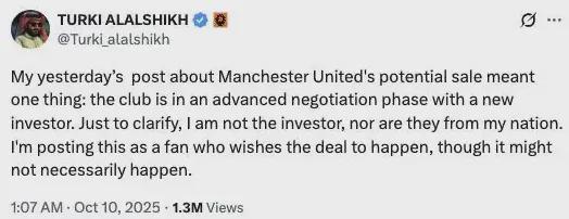 《镜报》昨晚(北京时间)报道,格雷泽家族考虑出售他们在曼联的股份,报价需超过50亿英镑,Turki Alalshik正在准备收购。《镜报》今早则报道,人家又亲自出面澄清,否认自己或任何沙特投资方参与收购曼联谈判。