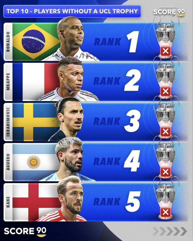 职业生涯从未染指欧冠冠军足坛巨星:大罗上榜但最可惜的不是他