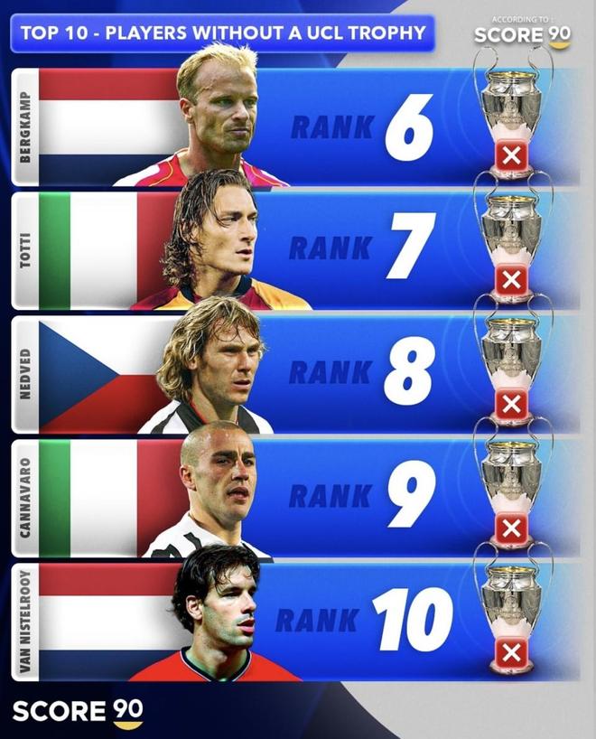 这是媒体Score 90评出的“欧冠无冠球星 TOP10”榜,罗纳尔多、伊布、托蒂、内德维德、凯恩、姆巴佩、范尼等大牌悉数在列,阵容耀眼,却都缺少一座“大耳朵杯”。同样是时代巨星,为何有人距离冠军只差一步,有人则被球队周期“错峰”? 下面就从离冠军最近与个人高度是否与团队匹配两个维度,梳理这份名单里“最可惜”的那一位。 具体榜单罗纳尔多(Ronaldo Nazário) 国籍:巴西 主要效力俱乐部:巴塞罗那、国际米兰、皇家马德里、AC米兰 职业生涯主要荣誉:世界杯冠军2次(1994、2002)、金球奖2次(1997、2002)、美洲杯冠军2次(1997、1999) 欧冠最好成绩:半决赛(2002–03,皇家马德里) 姆巴佩(Kylian Mbappé) 国籍:法国 主要效力俱乐部:摩纳哥、巴黎圣日耳曼、皇家马德里 职业生涯主要荣誉:世界杯冠军(2018)、世界杯金靴(2022)、法甲冠军多次 欧冠最好成绩:亚军(2019–20,巴黎圣日耳曼) 伊布拉希莫维奇(Zlatan Ibrahimović) 国籍:瑞典 主要效力俱乐部:阿贾克斯、尤文图斯、国际米兰、巴塞罗那、AC米兰、巴黎圣日耳曼、曼联 职业生涯主要荣誉:多国顶级联赛冠军、欧联杯(2016–17) 欧冠最好成绩:半决赛(2009–10,巴塞罗那) 阿圭罗(Sergio Agüero) 国籍:阿根廷 主要效力俱乐部:独立队、马德里竞技、曼城、巴塞罗那 职业生涯主要荣誉:英超冠军5次、欧联杯(2009–10)、美洲杯冠军(2021) 欧冠最好成绩:亚军(2020–21,曼城) 凯恩(Harry Kane) 国籍:英格兰 主要效力俱乐部:托特纳姆热刺、拜仁慕尼黑 职业生涯主要荣誉:世界杯金靴(2018)、英超金靴(2015–16、2016–17、2020–21)、欧洲金靴(2023–24) 欧冠最好成绩:亚军(2018–19,托特纳姆热刺) 博格坎普(Dennis Bergkamp) 国籍:荷兰 主要效力俱乐部:阿贾克斯、国际米兰、阿森纳 职业生涯主要荣誉:英超冠军3次、欧洲联盟杯2次(1991–92、1993–94) 欧冠最好成绩:亚军(2005–06,阿森纳) 托蒂(Francesco Totti) 国籍:意大利 主要效力俱乐部:罗马 职业生涯主要荣誉:世界杯冠军(2006)、意甲冠军(2000–01)、欧洲金靴(2006–07) 欧冠最好成绩:八强(2006–07、2007–08,罗马) 内德维德(Pavel Nedvěd) 国籍:捷克 主要效力俱乐部:布拉格斯巴达、拉齐奥、尤文图斯 职业生涯主要荣誉:金球奖(2003)、优胜者杯(1998–99)、意甲冠军多次 欧冠最好成绩:亚军(2002–03,尤文图斯;因停赛缺席决赛) 卡纳瓦罗(Fabio Cannavaro) 国籍:意大利 主要效力俱乐部:那不勒斯、帕尔马、国际米兰、尤文图斯、皇家马德里 职业生涯主要荣誉:世界杯冠军(2006)、金球奖(2006)、西甲冠军2次(2006–07、2007–08) 欧冠最好成绩:半决赛(2002–03,国际米兰) 范尼(Ruud van Nistelrooy) 国籍:荷兰 主要效力俱乐部:埃因霍温、曼联、皇家马德里、汉堡、马拉加 职业生涯主要荣誉:英超冠军(2002–03)、西甲冠军(2006–07)、欧冠最佳射手3次(2001–02、2002–03、2004–05) 欧冠最好成绩:半决赛(2001–02,曼联) 谁最可惜?答案:内德维德 为什么是他? 离冠军最近:2002–03 赛季带尤文杀进决赛,却因半决赛次回合累积黄牌停赛,决赛对米兰踢到点球大战才失冠——离“大耳朵杯”只差一张黄牌。 个人高度匹配:同一年摘得金球奖,状态与话语权都在巅峰;如果那场他能出场,尤文的中场推进和远射威胁都会提升,比赛走向很可能不同。 错失具有“不可复现性”:停赛这种偶然性+决赛输点球的戏剧性,让这座奖杯几乎是“伸手可及却被抽走”,遗憾感最强。 另外几位也很“亏”,但遗憾成因略不同: 罗纳尔多(Ronaldo Nazário):世界杯+金球齐了,欧冠却没冠;在皇马的巅峰夜(如老特拉福德帽子戏法)很神,但整体受伤病与球队周期影响,更多是“时代错位”的缺憾。 伊布拉希莫维奇(Zlatan Ibrahimović):典型的“走错队时间轴”——离开国米后穆帅三冠王,离开巴萨后瓜帅再夺欧冠;荣誉满屋,唯独少欧冠,叙事感强。 范尼斯特尔鲁伊(Ruud van Nistelrooy):三次欧冠最佳射手却无冠,说明个人产出足够顶,但团队层面的“最后一公里”始终差一点。 阿圭罗(Sergio Agüero):曼城时代多次冲冠未果,2021进决赛没拿到,球队两年后夺冠时他已不在——错峰加冕的典型。 博格坎普(Dennis Bergkamp):2006 距离奖杯只差一场;更遗憾的是飞行恐惧症限制了部分欧战客场。 凯恩(Harry Kane):2019 决赛失利;个人产出已证明级别,但仍处“在路上”,还不能下最终结论。 姆巴佩(Kylian Mbappé):已拿到一次亚军,年龄与平台都不封顶,谈“可惜”还早。 卡纳瓦罗(Fabio Cannavaro):国家队到顶(世界杯+金球),在欧冠更多是防线领袖但非进攻决定权,欧冠并没有出现“只差一脚”的那种戏剧时刻。 总结内德维德的遗憾=“当季金球 + 决赛停赛 + 点球惜败”,戏剧性和接近度都拉满,综合最可惜。 其他几位要么被球队周期与健康拖累(罗纳尔多、阿圭罗、范尼),要么被时间轴“错峰”捉弄(伊布);而凯恩、姆巴佩仍有充足窗口去把缺口补上。 |