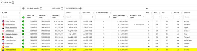 英超BIG6各队周薪前五榜来了:阿森纳、曼联、利物浦、曼城、热刺、切尔西一一对照,谁把钱砸在刀刃上、谁背着大合同一目了然。只看“前五高薪”,更能看出每队的薪资天花板与核心构成。数据截至北京时间2025-09-26。(数据来自知名机构Capology) 曼城(前五平均周薪31.7万英镑)名字 | 年龄 | 国籍 | 合同还剩几年 | 周薪(万英镑 / 万元) 哈兰德 | 25岁 | 挪威 | 9年 | 52.50 / 504.13 贝尔纳多·席尔瓦 | 31岁 | 葡萄牙 | 1年 | 30.00 / 288.07 马尔穆什 | 26岁 | 埃及 | 4年 | 29.50 / 283.27 斯通斯 | 31岁 | 英格兰 | 1年 | 25.00 / 240.06 多纳鲁马 | 26岁 | 意大利 | 5年 | 25.00 / 240.06 利物浦(前五平均周薪28万英镑)名字 | 年龄 | 国籍 | 合同还剩几年 | 周薪(万英镑 / 万元) 萨拉赫 | 33岁 | 埃及 | 2年 | 40.00 / 384.10 范戴克 | 34岁 | 荷兰 | 2年 | 35.00 / 336.09 伊萨克 | 25岁 | 瑞典 | 6年 | 28.00 / 268.87 加克波 | 26岁 | 荷兰 | 1年 | 25.00 / 240.06 埃基蒂克 | 23岁 | 法国 | 6年 | 20.00 / 192.05 维尔茨 | 22岁 | 德国 | 5年 | 20.00 / 192.05 阿森纳(前五平均周薪24.5万英镑)名字 | 年龄 | 国籍 | 合同还剩几年 | 周薪(万英镑 / 万元) 哈弗茨 | 26岁 | 德国 | 3年 | 28.00 / 268.87 加布里埃尔·热苏斯 | 28岁 | 巴西 | 2年 | 26.50 / 254.47 厄德高 | 26岁 | 挪威 | 3年 | 24.00 / 230.46 赖斯 | 26岁 | 英格兰 | 5年 | 24.00 / 230.46 约克雷斯 | 27岁 | 瑞典 | 5年 | 20.00 / 192.05 曼联(前五平均周薪24.3万英镑)名字 | 年龄 | 国籍 | 合同还剩几年 | 周薪(万英镑 / 万元) 卡塞米罗 | 33岁 | 巴西 | 1年 | 35.00 / 336.09 布鲁诺·费尔南德斯 | 30岁 | 葡萄牙 | 2年 | 30.00 / 288.07 德里赫特 | 26岁 | 荷兰 | 4年 | 19.50 / 187.25 马奎尔 | 32岁 | 英格兰 | 1年 | 19.00 / 182.45 库尼亚 | 26岁 | 巴西 | 5年 | 18.00 / 172.84 鲁本·迪亚斯 | 28岁 | 葡萄牙 | 4年 | 25.00 / 240.06 切尔西(前五平均周薪22.6万英镑)名字 | 年龄 | 国籍 | 合同还剩几年 | 周薪(万英镑 / 万元) 斯特林 | 30岁 | 英格兰 | 2年 | 32.50 / 312.08 里斯·詹姆斯 | 25岁 | 英格兰 | 4年 | 25.00 / 240.06 福法纳 | 24岁 | 法国 | 4年 | 20.00 / 192.05 恩佐·费尔南德斯 | 24岁 | 阿根廷 | 7年 | 18.00 / 172.84 库库雷利亚 | 27岁 | 西班牙 | 3年 | 17.50 / 168.04 托特纳姆热刺(前五平均周薪17.2万英镑)名字 | 年龄 | 国籍 | 合同还剩几年 | 周薪(万英镑 / 万元) 哈维·西蒙斯 | 22岁 | 荷兰 | 5年 | 19.50 / 187.25 罗梅罗 | 27岁 | 阿根廷 | 4年 | 19.50 / 187.25 麦迪逊 | 28岁 | 英格兰 | 3年 | 17.00 / 163.24 库杜斯 | 25岁 | 加纳 | 6年 | 15.00 / 144.04 穆阿尼 | 26岁 | 法国 | 1年 | 15.00 / 144.04 |