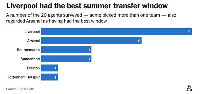 阿森纳实际上以六票位居第二。利物浦花费4.18亿英镑的采购狂潮(通过价值1.9亿英镑的球员销售抵消)为他们赢得了赞誉和榜首位置,尽管几位新援尚未产生化学反应。
