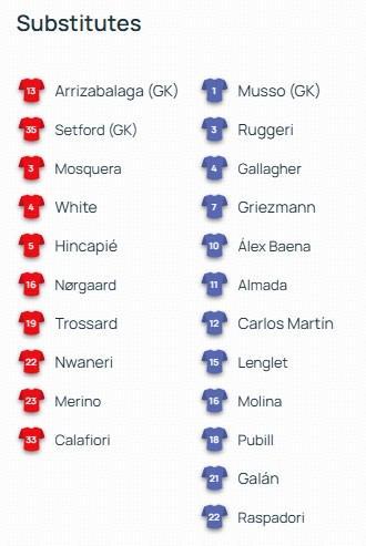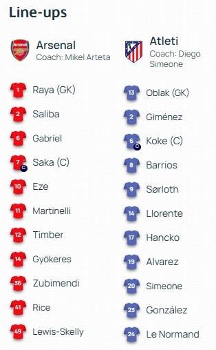 阿森纳首发:1-戴维-拉亚、2-萨利巴、6-加布里埃尔、7-萨卡、10-埃泽、11-马丁内利、12-廷贝尔、14-哲凯赖什、36-苏比门迪、41-赖斯、49-刘易斯-斯凯利 马竞首发:13-奥布拉克、2-希门尼斯、6-科克、8-巴里奥斯、9-瑟洛特、14-马科斯-略伦特、17-汉茨科、19-阿尔瓦雷斯、20-朱利亚诺-西蒙尼、23-尼古拉斯-冈萨雷斯、24-勒诺尔芒