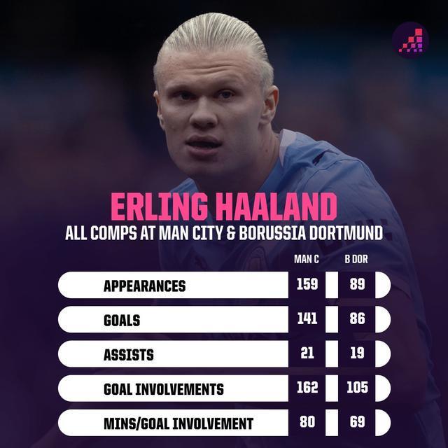 高效!哈兰德曼城生涯80分钟参与一球,多特生涯69分钟造一球
