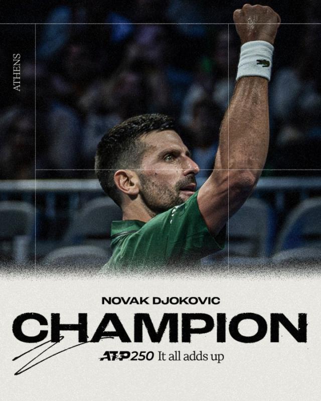 ATP250雅典站决赛,头号种子德约科维奇兑现第二个发球胜赛局,以4比6、6比3、7比5逆转二号种子穆塞蒂,对其取得6连胜,斩获本赛季第2座、职业生涯第101座巡回赛男单冠军。 莱巴金娜上月底压哨获年终席位,最终全胜夺年终冠军