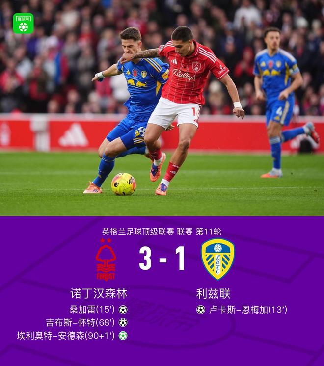北京时间11月9日,英格兰足球超级联赛第11轮,诺丁汉森林坐镇主场迎战利兹联。比赛开局阶段,利兹联通过一次快速进攻取得领先,阿伦森送出助攻,卢卡斯-恩梅加破门。仅两分钟后,诺丁汉森林迅速还以颜色,桑加雷将比分扳平。易边再战,诺丁汉森林持续加强攻势,第68分钟,奥马里-哈钦森突破后送出关键传球,吉布斯-怀特头球破门帮助球队反超比分。进入补时阶段,埃利奥特-安德森点球稳稳命中,锁定胜局。最终,诺丁汉森林以3比1逆转战胜利兹联。 关键事件 第13分钟,先拔头筹,恩梅加打远角破门,利兹联1-0领先