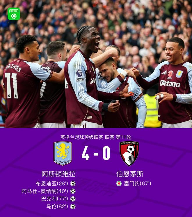 北京时间11月9日22:00,英超第11轮,阿斯顿维拉坐镇主场迎战伯恩茅斯。比赛中,布恩迪亚任意球破门,随后阿马杜-奥纳纳远射再下一城;下半场,塞门约主罚点球被大马丁扑出,巴克利、马伦先后取得进球。最终,阿斯顿维拉以4-0战胜伯恩茅斯。 关键事件 第28分钟,正反手教学,布恩迪亚位置相近的任意球直接破门,维拉1-0