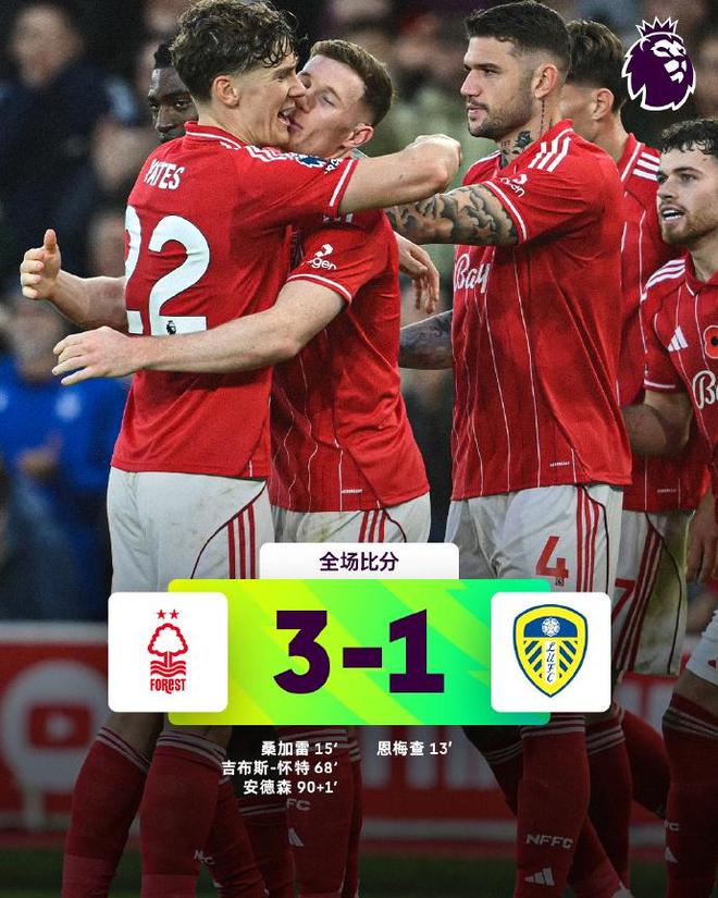 全场比赛,维拉掌控了局面,上半场依靠布恩迪亚、阿马杜-奥纳纳的联袂破门,取得2-0的领先优势,下半场,门将大马丁内斯还扑出了伯恩茅斯的点球,巴克利、蒂勒曼斯各进一球,最终4-0大胜伯恩茅斯,积18分升至积分榜第七位。 据统计,维拉在英超的近五粒进球全部来自于禁区外的射门,成为了英超历史上第四支连续五粒或以上的进球全都由远射打进的球队,上一次做到的球队还是2011年4月至5月的热刺。 诺丁汉森林VS利兹联