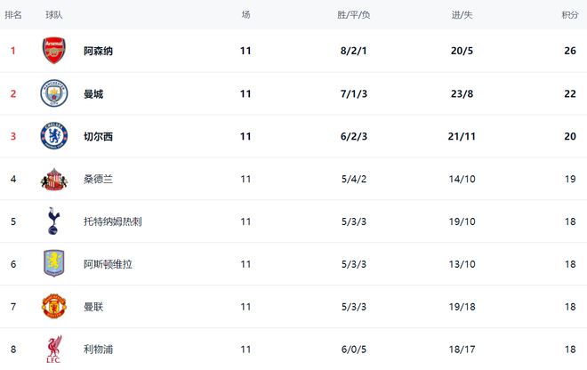 在积分榜上,阿森纳依然排名榜首,8胜2平1负,拿到26分。曼城赢球之后,总积分达到22分,升回第2名,只落后阿森纳4分。切尔西以20分排名第3。第4的是大黑马桑德兰,拿到19个积分。热刺、阿斯顿维拉、曼联、利物浦和伯恩茅斯这5支球队都是18分,欧冠资格的争夺非常激烈。 |