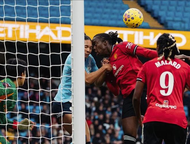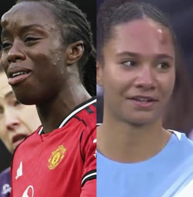 曼联女足球员阿武乔和曼城女足球员杰德-罗斯在下半场临近结束时,因争顶头球时头部相撞,二人双双倒地,导致比赛长时间中断。 经检查,二人均无大碍。不过,这次剧烈碰撞导致二人额头处均出现了巨大肿块,场面看起来触目惊心。