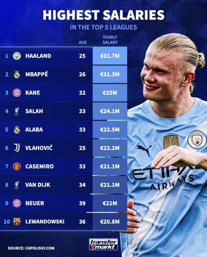 欧洲五大联赛工资榜排名发布!萨拉赫年薪近2亿卡塞米罗1.73亿元