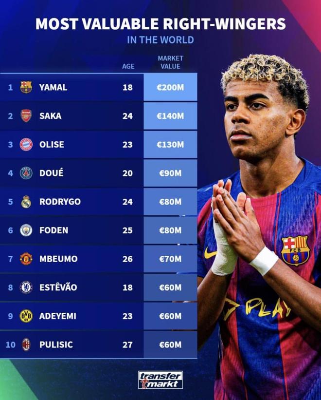 身价分析合理: 据德国转会市场的近期数据,亚马尔(2亿欧元)与萨卡(1.4亿欧元)属于高位但有支撑的定价:持续首发、参与度高,联赛与欧战均能稳定制造威胁。罗德里戈(8000万欧元)在强队里能打多个前场点,关键场次贡献稳定,身价与角色匹配。普利西奇(6000万欧元)在意甲即战力明确、数据和出勤都不差,属稳健档,波动区间可控。