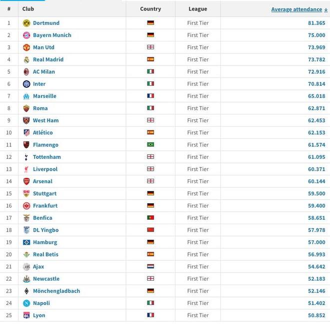 1.多特蒙德 场均81365名观众 2.拜仁 场均75000名观众 3.曼联 场均73969名观众 4.皇马 场均73782名观众 5.米兰 场均72916名观众 6.国米 场均70814名观众 7.马赛 场均65018名观众 8.罗马 场均62871名观众 9.西汉姆联 场均62453名观众 10.马德里竞技 场均62153名观众 11.弗拉门戈 场均61574名观众 12.托特纳姆热刺 场均61095名观众 13.利物浦 场均60371名观众 14.阿森纳 场均60144名观众 15.斯图加特 场均59500名观众 16.法兰克福 场均59400名观众 17.本菲卡 场均58651名观众 18.大连英博 场均57978名观众 19.汉堡 场均57000名观众 20.皇家贝蒂斯 场均56993名观众 21.阿贾克斯 场均54642名观众 22.纽卡斯尔 场均52183名观众 23.门兴格拉德巴赫 场均52146名观众 24.那不勒斯 场均51402名观众 25.里昂 场均50852名观众