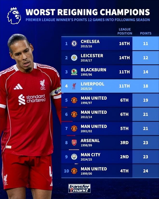 德转列英超卫冕冠军12轮后最低积分榜的: 1.切尔西 (2015/16赛季),第16名,11分 2.莱斯特城 (2016/17赛季),第14名,12分 3.布莱克本 (1995/96赛季),第11名,14分 4.利物浦 (2025/26赛季),第11名,18分 消息来源:转会市场 5 - 新人来竞价英格兰赛事 据《泰晤士报》报道,尽管在欧足联俱乐部赛事(欧冠、欧联杯、欧协联等)转播权的竞标中未能成功,但网飞正在考虑竞标部分英超的电视转播权。此前,网飞曾竞标欧超杯的全球转播权以及2027-2031年德国的欧冠转播权。