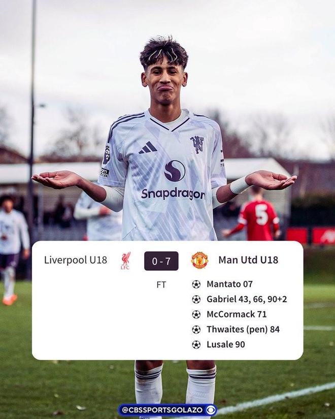 在本周六进行的U18英超联赛中,曼联U18客场7-0大胜利物浦U18,其中15岁小将JJ-加布里埃尔完成帽子戏法。