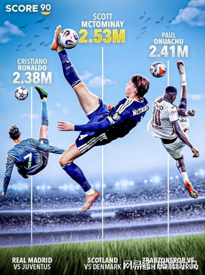 类似的成长模式其实在国家队中似曾相识,羽翼未丰时,麦克托米奈被人才济济的三狮军团忽略情有可原,但2018年得到苏格兰国家队征召的他也并非一步登天,准确说从右后卫起步的麦克托米奈一步一步地成为全民偶像。 数据显示,自从2023年以来,麦克托米奈为苏格兰国家队打进了12球,进球数量至少是其他任何队内球员的两倍。 最近一次的英雄主义体现在对阵丹麦的世预赛中,苏格兰拿到了2026年世界杯资格,麦克托米奈打进了一粒美如画的倒钩,值得一提的是,他在倒钩瞬间脚尖高度达到了惊人的2.53米,超越了奥努阿楚的2.41米和C罗的2.38米,一举刷新了足球史上最高倒钩进球纪录。