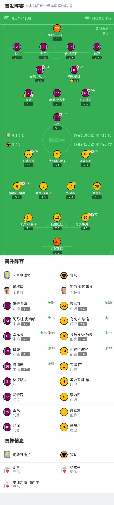 维拉10狼队,卡马拉世界波,大马丁屡献神扑