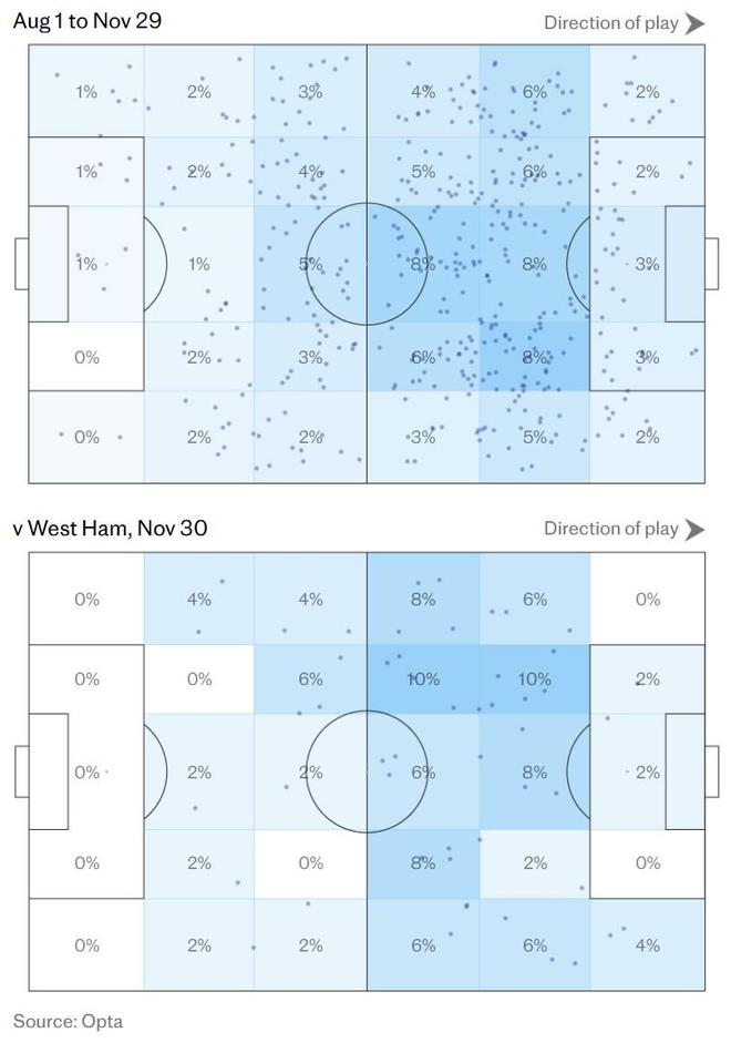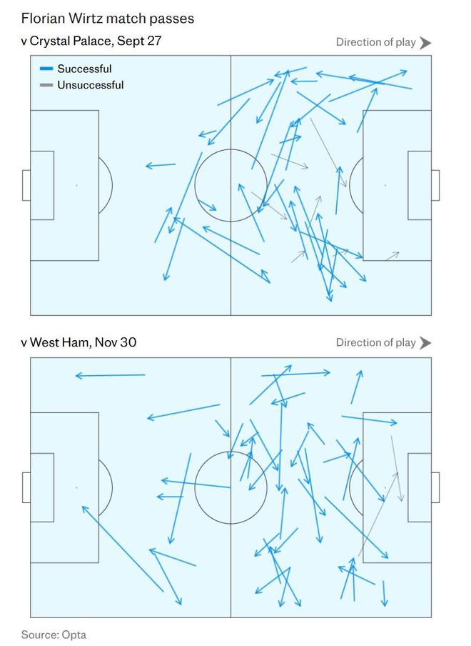 利物浦引进维尔茨,本是看中他在“防线之间”游弋并掌控比赛节奏的能力。此役的关键在于,斯洛特首次安排维尔茨在赫拉芬贝赫、索博斯洛伊和麦卡利斯特这三名中场身前,以10号位身份首发。其中,索博斯洛伊牺牲了习惯的突前位置,承担了右路的攻防职责。 此前,将维尔茨安排在中场三人组之一时,球队常显得失衡。一旦他丢球,因中场结构变化而留下的空当极易被对手利用打出反击,队友间的联系也时常中断。而在伦敦体育场,球队阵型明显更为稳固,维尔茨与中场队友之间首次展现出正在形成的默契。尽管西汉姆联给予了过多空间,允许维尔茨轻松接球转身,但他确实看起来更自信、更高效,本应收获一粒进球或至少一次助攻。 在无球时,利物浦也能以更多人数包围对手实施反抢。一个有趣的数据是:维尔茨本场在进攻三区及传入禁区的关键传球数,其实与他本赛季的平均水平相近(他仍在等待英超首次助攻)。但这并不能反映他本场比赛在速度、决策准确性和身体对抗上的全面提升。