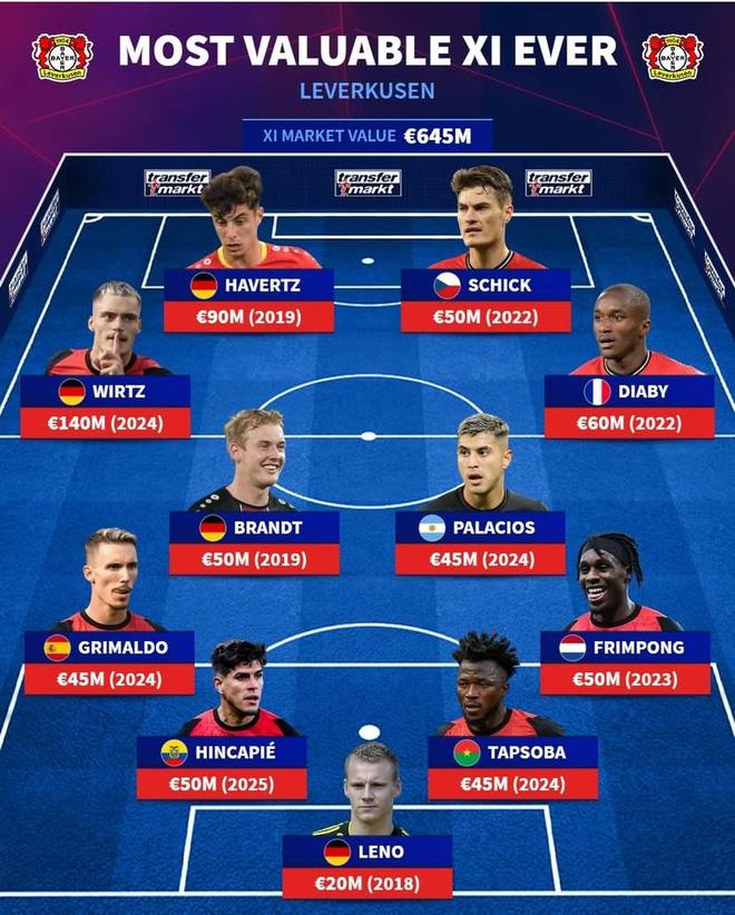 门将 莱诺(2018年)2000万欧元 后卫 弗林蓬(2023年)5000万欧元、塔普索巴(2024年)4500万欧元、因卡皮耶(2025年)5000万欧元、格里马尔多(2024年)4500万欧元 中场 穆萨-迪亚比(2022年)6000万欧元、帕拉西奥斯(2024年)4500万欧元、布兰特(2019年)5000万欧元、维尔茨(2024年)1.4亿欧元 前锋 希克(2022年)5000万欧元、哈弗茨(2019年)9000万欧元 总身价:6.45亿欧元 【上咪咕独家看英超】 |