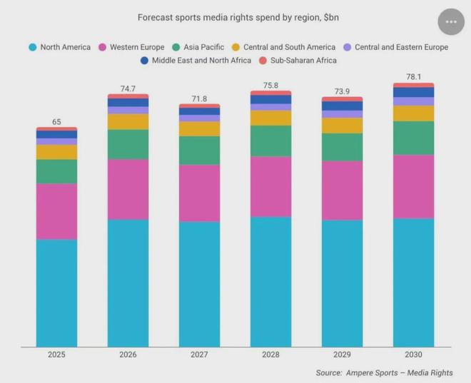 西甲全球体育版权费用预测 图源:Ampere Analyse 支撑这一预测的基础来自北美市场,自2025-26赛季开始,迪士尼旗下的ESPN和AT&T每年合计为NBA版权支付27亿美元,而2029年MLB也将开启新的转播周期,苹果预期将加入争夺新周期MLB的流媒体版权,涨价几乎板上钉钉。此外,普遍被认为价值低估的NFL在2026年也有望开启新周期版权谈判,达成一份更高价值的转播协议也是市场预期的结果。Ampere在报告中预测,北美将从2025年的318亿增长至2030年的380亿美元,占据全球总预计增幅的47.7%。 相比于北美市场的扩张,欧洲的增长预期则相对稳定,到2030年只增长30亿美元到213亿美元。尽管头部赛事如欧冠、世界杯、冬奥会等依然受到热捧,但欧洲转播机构在财力和竞价意愿上显然不如北美同行,加上中小联赛版权遇冷的现状依然持续,欧洲市场在体育版权上的增长幅度有限。 值得注意的是,Ampere预测亚洲版权市场将从2025年的72亿美元提升到2030年的99亿美元。印度板球联赛在2027年将迎来新的转播周期,T20世界杯等国际板球理事会旗下赛事也有望将成为亚洲体育版权费用增长的新驱动力。