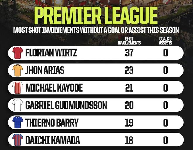 据Opta统计,利物浦中场维尔茨本赛季英超直接参与了37次射门,但仍0球0助,为所有还没直接参与进球的球员中最多。