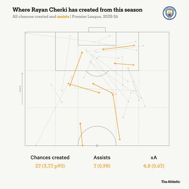 毫不意外,谢尔基在英超创造了最多机会、直塞球、预期助攻值以及每90分钟助攻数,其创造力分布图(见下文)突显了众多他可以将球送入禁区的通道。