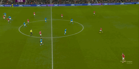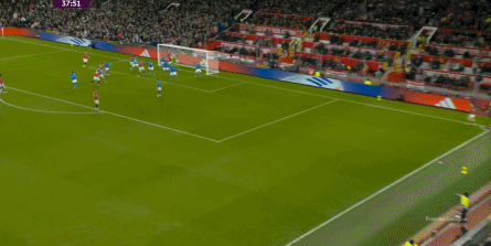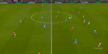 在大面儿上,依然是343的站位,通过这一站位和人员结构来在防守端出力,倒是还说得通,但是在进攻端,开局的曼联已经展现出需要依靠库尼亚单打的情况了: