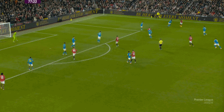 这个势头逐渐下降,直至最后丢球的过程,其实说明了很多事情。 齐尔克泽虽然收获了进球,但他和谢什科的联系依然很差,中间必须要有人协助,就像达洛特所做的那样,但达洛特并不能常态性地出现在他们之间,因为后卫线上的海文需要保护,而你不能让齐尔克泽去保护。 可是除了达洛特,谁还能帮齐尔克泽联系谢什科呢? 其实是没有的,与其如此,摆出一个没有单兵进攻能力,也不能参加防守的齐尔克泽,在这里假装右边锋是没用的,哪怕你将齐尔克泽和谢什科视为双前锋,他俩不仅难以搭配,还会导致变成第三人的库尼亚的职责和负担急剧增加。 所以,换下齐尔克泽是对的,但这样一来,你就只能让小孩出场了。 换上小孩,曼联实际上会变成532的结构,或者说是5311,因为组织进攻的任务还在库尼亚身上,但他至少不用回来防守了。 结构依然很差,但合理程度有所改善,所以在下半场体能充足的时候,虽然进攻缺乏套路和质量,比如球员的单兵操作明显增加: