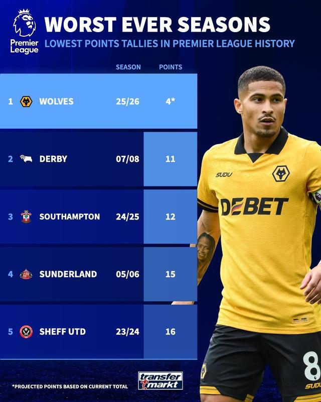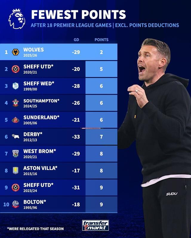 此前根据德转数据,在第18轮时,狼队已经创造了英超球队前18轮的最低分纪录,而这一榜单上所有球队当赛季最终都降级。