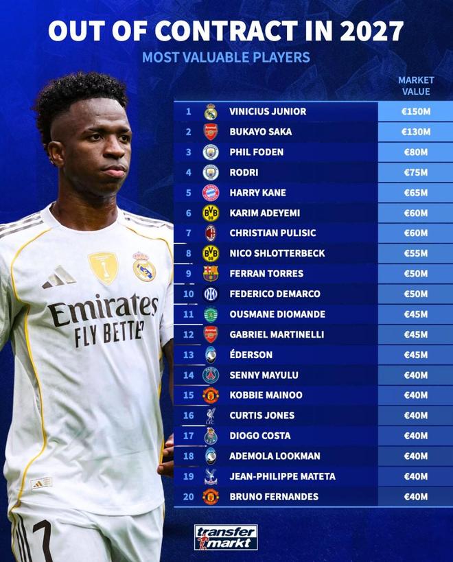 德转列合同2027年到期球员身价榜:维尼修斯、萨卡、福登前三