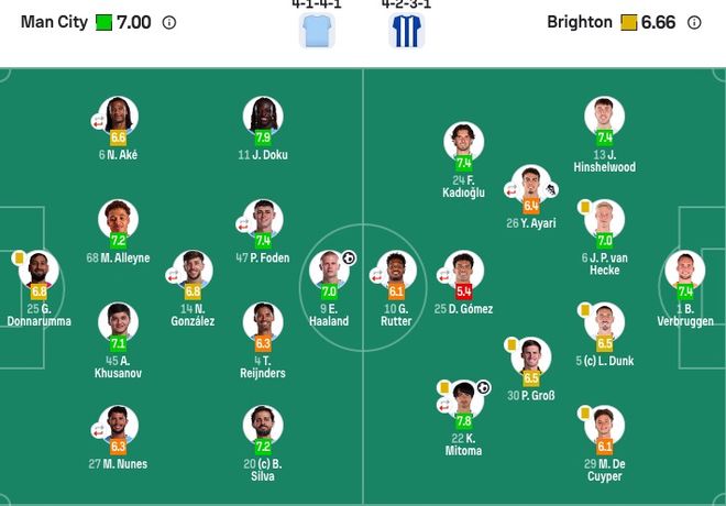 曼城首发:25-多纳鲁马、27-努内斯(73'82-刘易斯)、45-胡桑诺夫、68-阿莱恩、6-阿克(64'33-奥赖利)、14-尼科·冈萨雷斯(73'16-罗德里)、20-B席、4-赖因德斯、47-福登(73'10-谢尔基)、11-多库、9-哈兰德