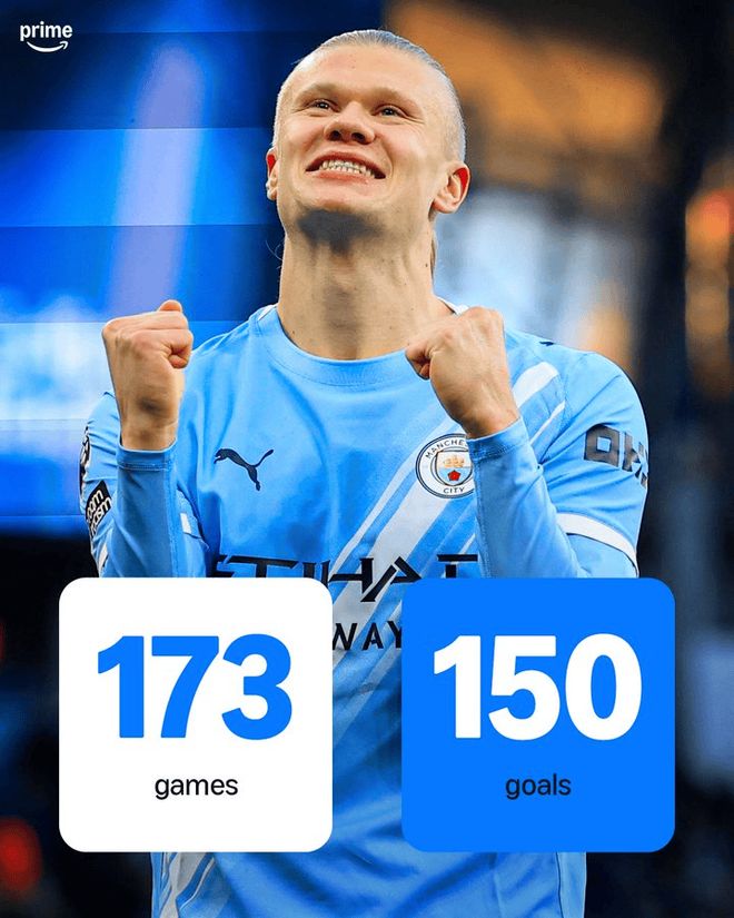 哈兰德迎来曼城生涯150球里程碑,哈兰德仅用了173场比赛便达成这一成就,刷新了英超自成立以来的最快纪录,领先其他球员至少28场比赛。