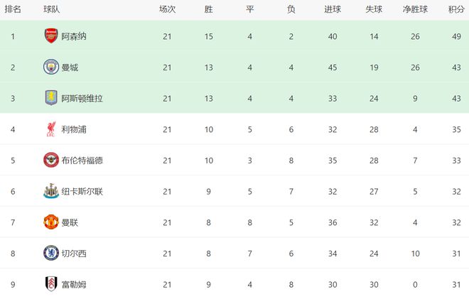 阿森纳虽然只拿到一场平局,但依然占据了榜首位置。阿森纳21轮狂揽49分排名第1,身后的曼城和阿斯顿维拉都是43分。也就是说,阿森纳有6分的优势,依然是夺冠最大热门。而利物浦则落后有点多了,只拿到35分,排名第4。事实上,利物浦第4的位置并不稳,与身后的球队差距很小。 |