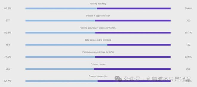 本场利物浦的总传球次数(509vs459)、传球准确率(89%vs86.3%)、前场传球次数(300vs277)、前场传球准确率(88.7%vs82.3%)全面占优!这可是在阿森纳的主场。 下半场72分钟,天空体育打出数据:当时的下半场数据,利物浦在进攻三区传球65次远超对手16次,控球率达到75%。
