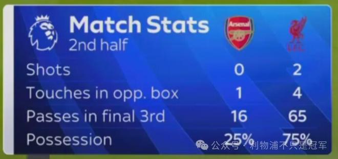 阿森纳上半场虽然场面上占优,但并没获得多少真正的机会。反而是利物浦逐渐获得了心理上的优势和信心。 2、利物浦下半场为什么能反客为主? 这不只是我的看法,也是天空体育加里-内维尔、罗伊-基恩的看法。86分钟,天空体育打出数据统计,当时阿森纳上一次射门还是上半场44分钟,直到91分钟才有下半场第一次射门。