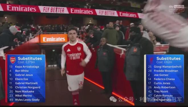 3、今天斯洛特为什么不换人 今天斯洛特直到布拉德利受伤才用了全场唯一一次换人,而阿尔特塔则用满了5个换人名额。 这首先是因为阿森纳有人可换啊!下半场开始前,天空体育打出对比:两队替补席“造价”,阿森纳2.73亿英镑,利物浦不到阿森纳的零头,6200万英镑。