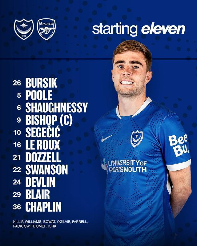 朴茨茅斯首发:26-布尔西克、24-德夫林、22-斯旺森、6-肖内西、5-普尔、16-勒鲁、21-多泽尔、29-布莱尔、10-塞格契奇、36-查普林、9-毕晓普