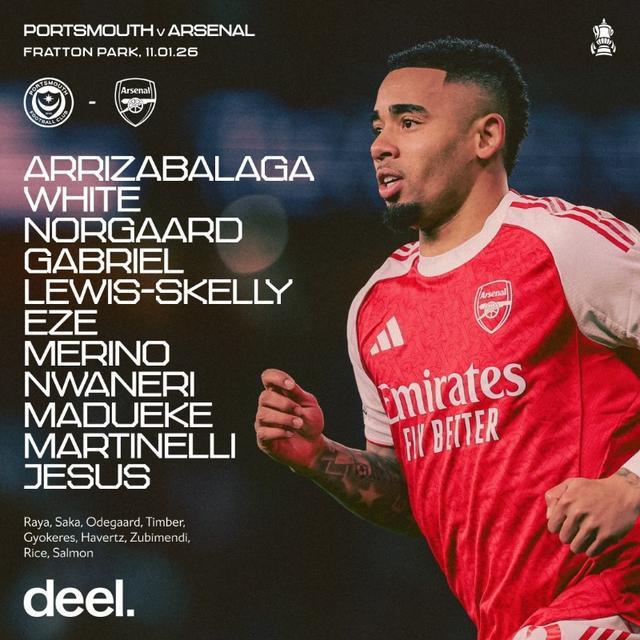 阿森纳客战朴茨茅斯:埃泽、热苏斯首发,马杜埃凯、凯帕出战