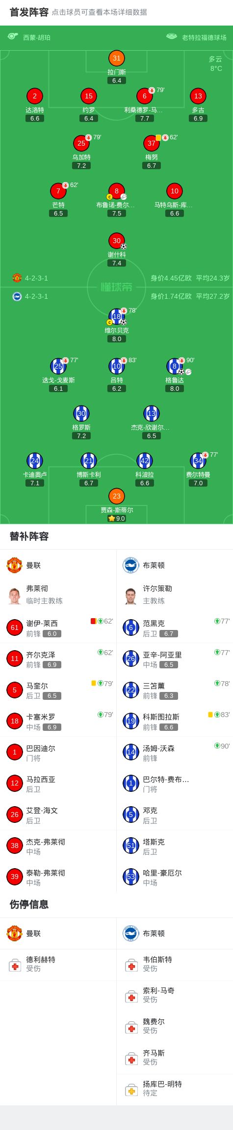 曼联12布莱顿,格鲁达传射建功,谢什科破门,莱西染红