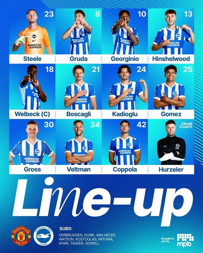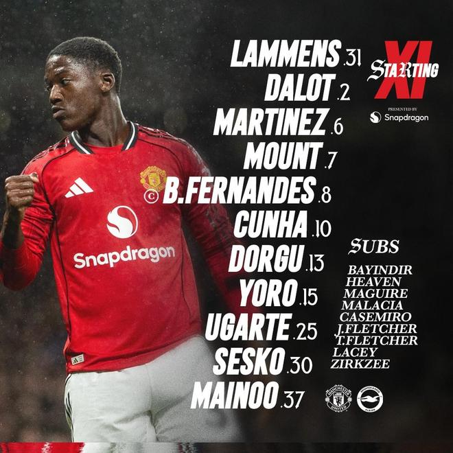 曼联首发:31-拉门斯、13-多古、15-约罗、6-马丁内斯、2-达洛特、37-梅努、25-乌加特、7-芒特、8-B费、30-谢什科、10-库尼亚 替补:1-巴因迪尔、5-马奎尔、11-齐尔克泽、18-卡塞米罗、26-海文、38-杰克-弗莱彻、39-泰勒-弗莱彻、61-莱西 布莱顿首发:23-斯蒂尔、42-科波拉、24-卡迪奥卢、21-博斯卡利、34-费尔特曼、13-欣谢尔伍德、25-戈麦斯、30-格罗斯、8-格鲁达、10-吕特、18-维尔贝克 替补:1-费布鲁亨、5-邓克、6-范黑克、14-沃森、19-科斯图拉斯、22-三苫薰、26-阿亚里、51-塔斯克、53-豪厄尔