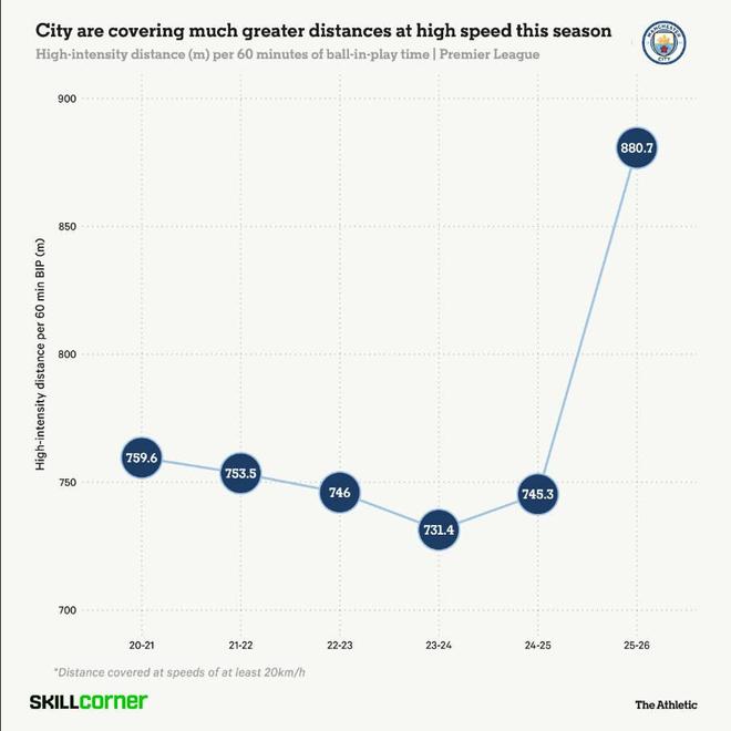 这是瓜迪奥拉的球队,因此仍然存在一个基本结构,球员们占据特定区域以便进行熟悉的传球模式和进攻方式。 但由于中场有了更强的运动能力和对抗能力,曼城在比赛的组织阶段可以即兴发挥,以适应英超联赛日益紧张的节奏。 疲劳和伤病:曼城能否继续保持这种状态? 曼城显然更有能力打对攻,但比赛后期的疲劳可能会削弱这一进步。 根据SkillCorner的追踪数据,曼城每60分钟的高强度跑动距离(以20公里/小时或更高速度跑动)增加了约18.2%,这给核心球员群体带来了额外的体能负担。