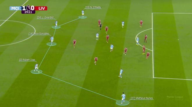 曼城对阵利物浦的首个进球也体现了这些理念,在那场比赛中,多库——传统上是一名拉边的边锋——在中路的狭小空间中表现出色。 控球从曼城半场深处开始,奥赖利被萨拉赫逼入角落,接着福登及时赶到,接到奥赖利的传球,躲过3次抢断后将球传给尼科-冈萨雷斯。 几次传球后,多库晃过索博斯洛伊分球,然后尼科-冈萨雷斯突破利物浦的防线,与谢尔基打出一二配合,随后将球分给有空间进攻的边后卫努内斯。