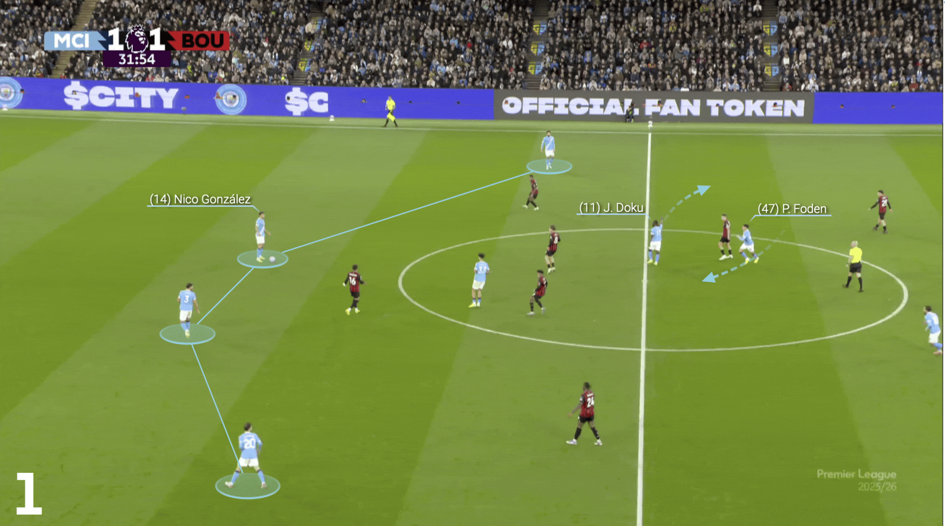 例如,在哈兰德对阵伯恩茅斯的第二个进球的进攻过程中,我们可以看到控球时的宽度形态,B席填补在右后卫位置,而奥赖利则向内游动。 在第二个画面中,尼科-冈萨雷斯将球传给福登,福登与多库轮转进入一个空当,谢尔基也意识到需要回撤,接到福登的一脚传球,福登的移动吸引了中后卫塞内西进入中场。 通过三脚快速传球——包括两次一脚传球——哈兰德被送到门前,他们利用对方的高压迫完成了一次快速组合进攻。