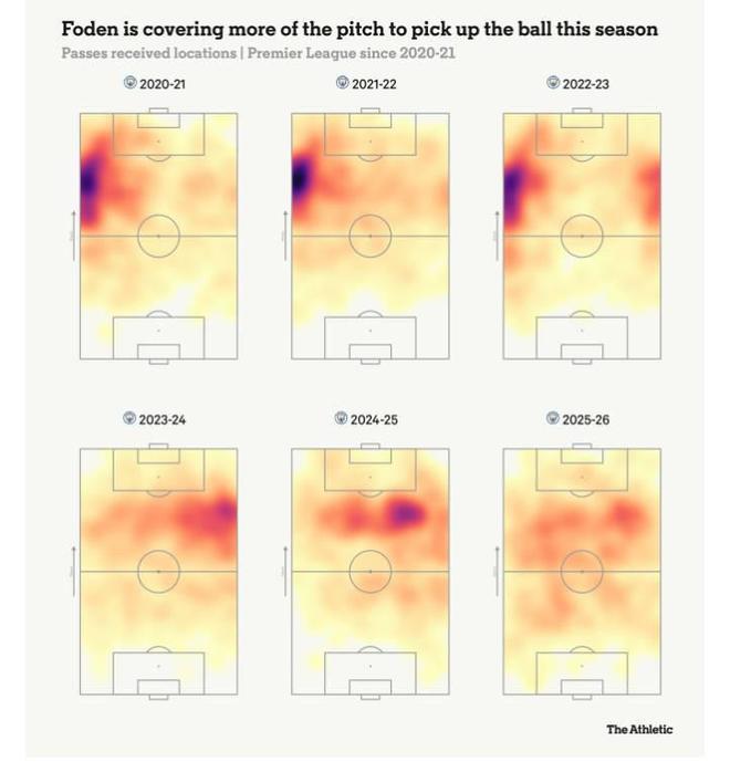 当边后卫站位靠前且拉开宽度时,许多球队会在场地上拉开以尝试覆盖曼城的宽度,这可能在对方的压迫中打开空隙,而曼城尝试通过让他们技术最出色的球员回撤到更深的位置来快速通过这些空隙传球。 瓜迪奥拉经常谈到“狭小空间”时提到福登,称赞他在压力下接球和处理球的能力以及他在下一步动作中的“侵略性”。 在过去的几年里,这些空间通常出现在对方禁区边缘,因为他们在曼城控球时被迫退缩并尝试保持阵型紧凑。 但英超的教练们现在更愿意对曼城进行压迫,这意味着福登所擅长的拥挤区域出现在离球门越来越远的地方。 值得注意的是,福登、谢尔基甚至多库都在回撤接球并与他们的队友配合,通常会聚集在一起通过快速的一脚出球摆脱逼抢,这与过去几个赛季中那种经过排练的模式和耐心、位置固定的打法大相径庭。