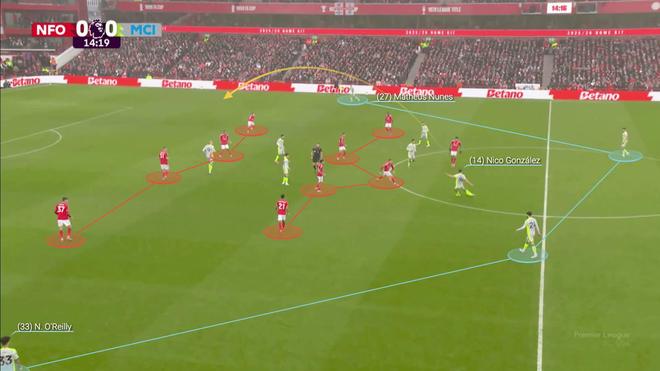 英超变得越来越注重身体对抗,各队可以通过强有力的防守表现和中场的运动能力来压制曼城的进攻布置,并迅速反击。 在这种新的、更开放的阵型中,曼城仍然容易受到反击的威胁,但由于新援如赖因德斯以及尼科-冈萨雷斯和他们活跃的边后卫的回防能力,他们比上赛季更有效地应对这些威胁,同时自身的进攻也更具威胁。 对阵诺丁汉森林时,曼城乐于通过直接的对角传球找到边后卫,利用宽度来绕过对方的4-5-1阵型。