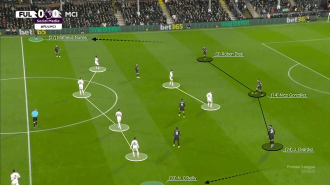 瓜迪奥拉为增强控球优势所做的一项关键创新是,当球队控球时,将一名或两名边后卫推入中场。这意味着曼城在没有边后卫前插参与进攻的情况下,边路缺乏突破力,特别是在上个赛季。 但这样做可以让他们的中场充满技术出色的球员,这些球员通过对方防线中路传球,并在进攻三区控球。 然而,在去年四月足总杯四分之一决赛战胜伯恩茅斯后,瓜迪奥拉意识到左后卫尼科-奥赖利的奔跑能力可以为曼城在边路提供更多的推进力,尤其是在对手上前施压时。 努内斯被安排在另一侧,曼城开始将边后卫用作解围路线,拉开对手的防线,并进攻任何出现的空当。 例如,在对阵富勒姆时,尼科-冈萨雷斯回撤组成三后卫阵型,让中后卫分开,而边后卫则向前推进。